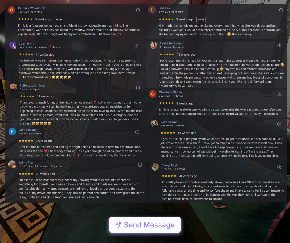 99% of my clients recommend me to friends and family. With a strong local presence and clients who travel hours to see me, my work speaks for itself. Check out our Google and Facebook reviews to see why.
